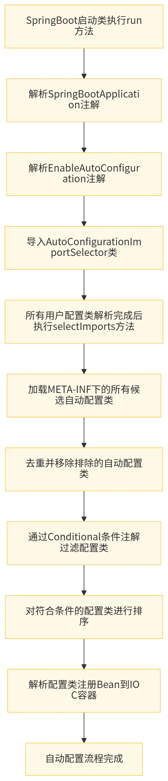 当AutoConfigurationImportSelector返回符合条件的自动配置类全限定名后,Spring容器会将这些类作为配置类,解析其中的@Bean方法,将对应的Bean实例注册到IOC容器中,整个自动配置流程完成。
