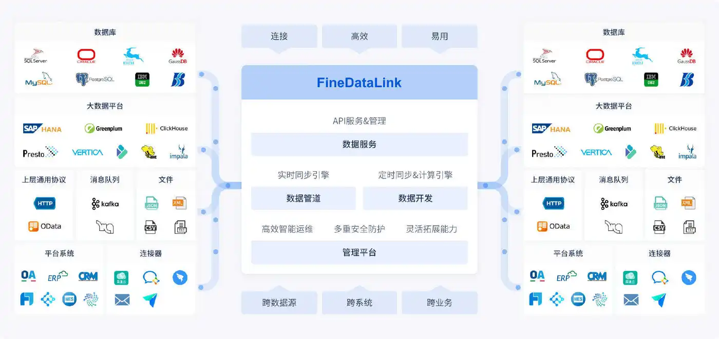 在现实情况中,企业的数据往往分散在几十个甚至上百个不同的系统里,比如ERP、CRM、MES等等,每个系统都有自己的数据库。 这就形成了我们常说的“数据孤岛”。这时候,就需要专业的数据集成与处理工具来打通这些壁垒,像FineDataLink就是一款专注于此的产品,它能无缝衔接关系型和非关系型数据库,不管是 MySQL、PostgreSQL 这类关系型数据库,还是 Redis、MongoDB、HBase 等非关系型数据库,基本能覆盖所有主流场景,高效、稳定地将这些分散在不同业务系统、不同数据库中的数据,进行整合、清洗和转换,为后续的数据分析提供高质量、统一的数据源。