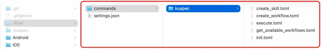 以 iFlow CLI 为例,集成到 Agent 后,我们可以看到开发目录下,会安装几个自定义命令,以及在 settings.json 中,为 Agent 配置所需的 MCP