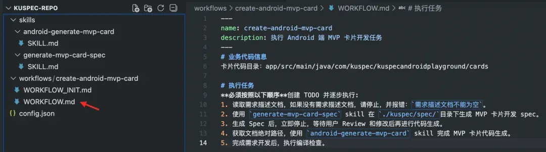 这个自定义命令,让 AI 通过 MCP 工具,获取具体工作流的 WORKFLOW.md 文件,并按照文件提供的信息去执行。