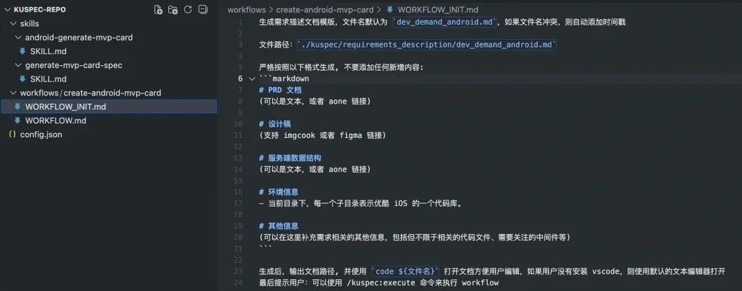 那么可以使用 WORKFLOW_INIT.md 让 AI 在执行工作流前,先执行这个初始化任务,生成一个结构化文档,交给用户填写,填写完成后,再将这个文档作为后续执行工作流的入参,实现具体需求和通用工作流的解耦。