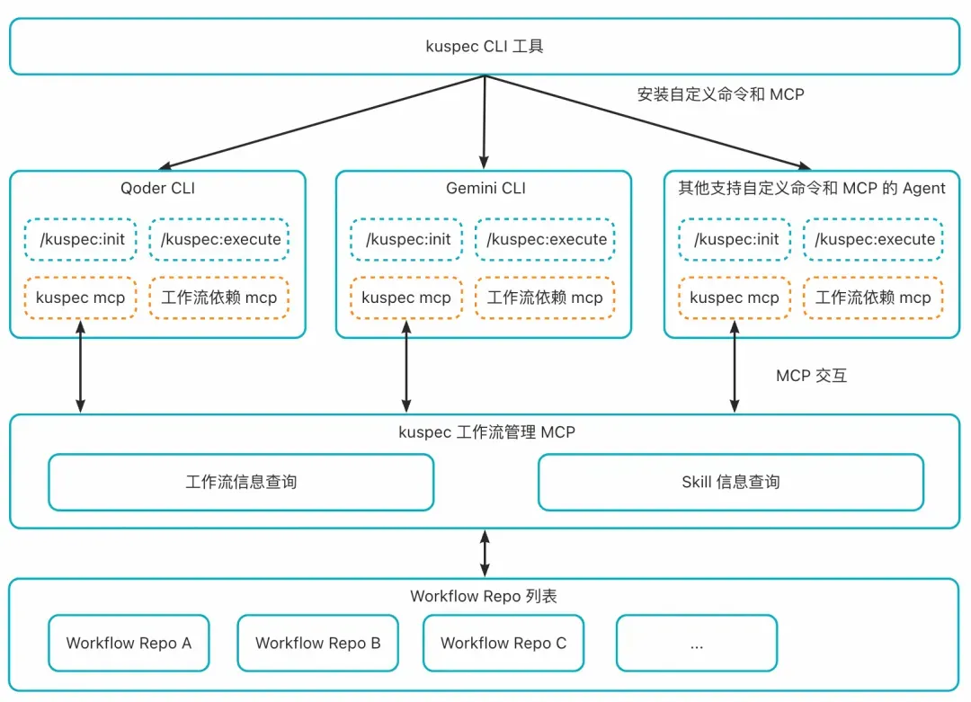 我们可以编写一个 CLI 工具,在开发目录执行。通过为不同的 Agent 安装自定义命令和MCP,将工作流能力集成到对应 Agent 中。