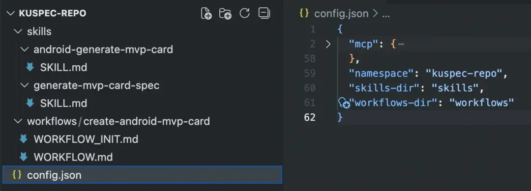 包含一个仓库的配置文件(config.json),以及若干个工作流和Skill。