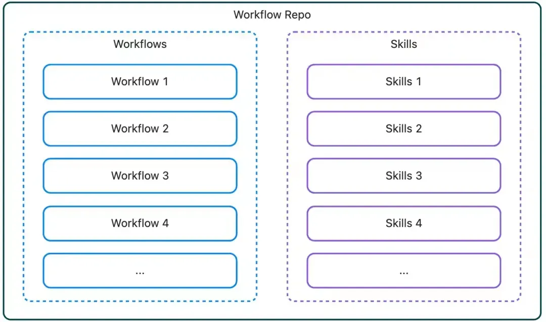 WorkflowRepo 即工作流仓库,包含了若干 Workflow 和 Workflow 所用到的 Skill。他可以通过 git 仓库的进行迭代和分法,方便团队同学使用。