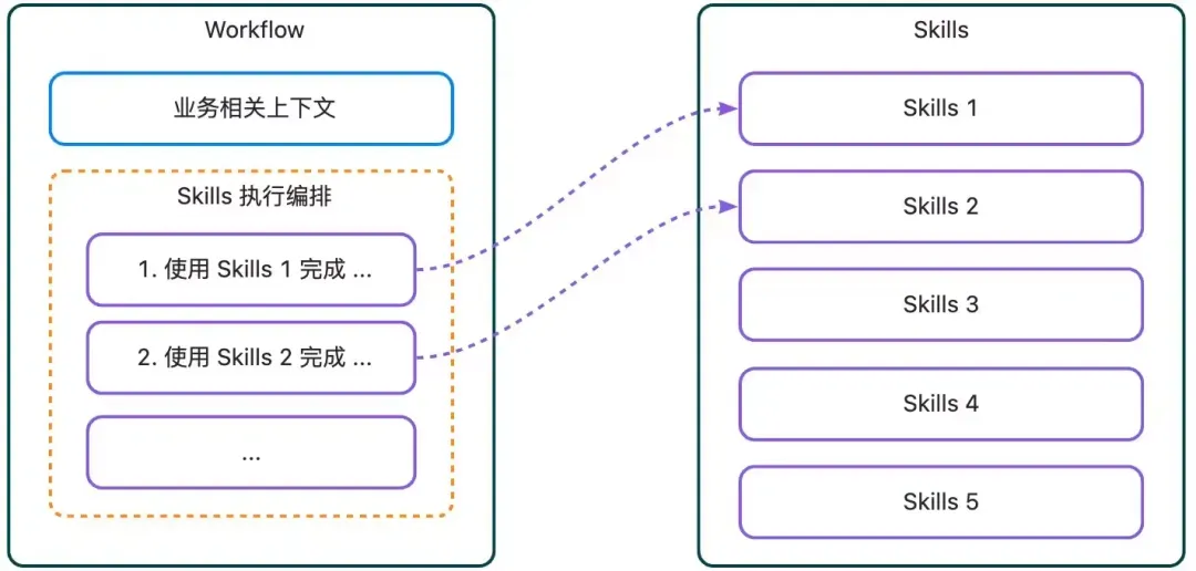 工作流包含特定业务的上下文,以及对通用 Skill 的执行编排。
