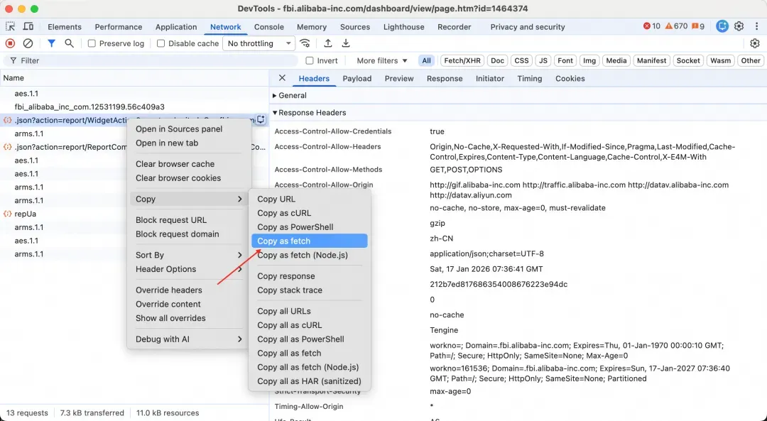 2. 在 DevTools Network 面板中 Copy as fetch,提前构造请求脚本;