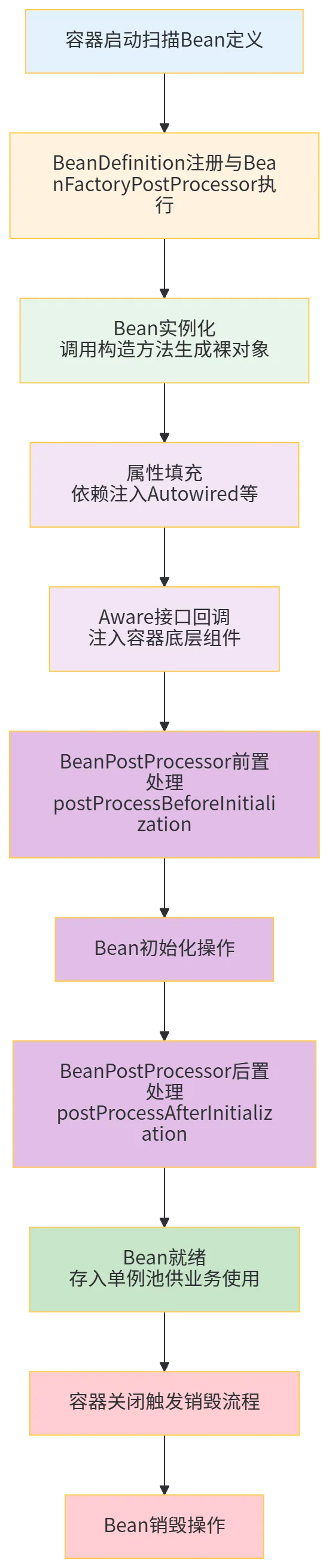 new关键字手动实例化,对象的创建、属性赋值、销毁全由开发者自己控制,生命周期仅与JVM的垃圾回收相关。 - Spring Bean:由Spring IoC容器统一管理的对象,容器会按照固定的流程,完成Bean的实例化、属性注入、初始化、销毁全生命周期管控,同时提供了大量可插拔的扩展点,允许开发者在生命周期的任意节点介入,定制Bean的行为。