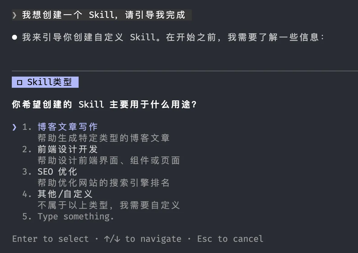 Claude:「我想创建一个 Skill,请引导我完成」 Claude会启动专门的创建引导流程,询问你技能名称、功能描述、预期用途- 完成后系统会生成一个