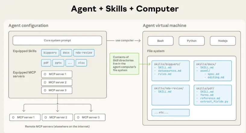 Skills 在代码执行环境中运行,Claude 在该环境中拥有文件系统访问、bash 命令和代码执行能力。可以这样理解:Skills 作为目录存在于虚拟机上,Claude 使用与您在计算机上浏览文件相同的 bash 命令与它们交互。