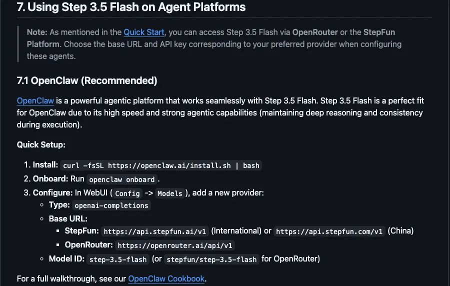 Step 3.5 Flash 接入  OpenClaw  的推荐配置: https:// github.com/stepfun-ai/S tep-3.5-Flash?tab=readme-ov-file#7-using-step-35-flash-on-agent-platforms