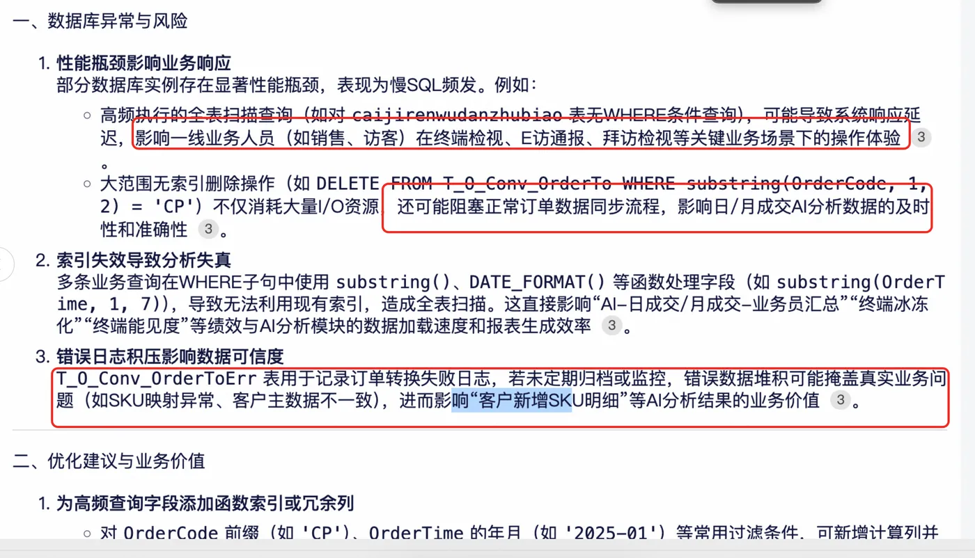 而当某项指标真的异常时,DataClaw 不只是报个数字,它会同时给出诊断建议:是该加索引、该清理连接池、还是该扩容。