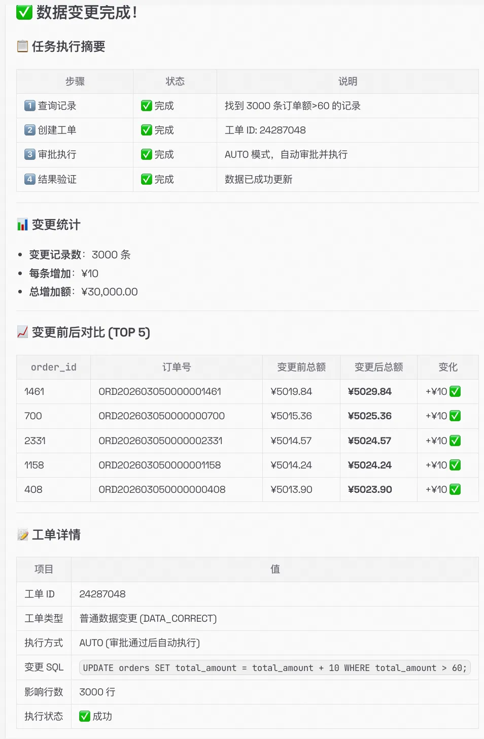 - 多任务编排 — 一句话串联查询→订正→验证→通知的完整工作流,跨库跨集群。