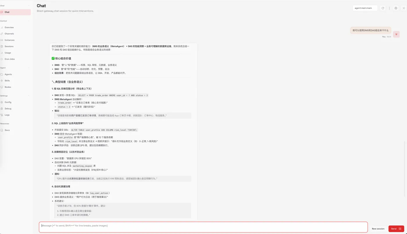 - 智能运维报告 — 融合 DMS Meta Agent Skill(业务语义理解)与 DAS Agent Skill(慢 SQL 深度诊断),让运维报告说"人话"。不再只告诉你"某条 SQL 耗时 12 秒",而是直接说清"这是下单时的库存校验查询,高峰期每秒 800 次,导致支付链路延迟上升 40%"。讲业务影响,业务方才愿意配合优化。
