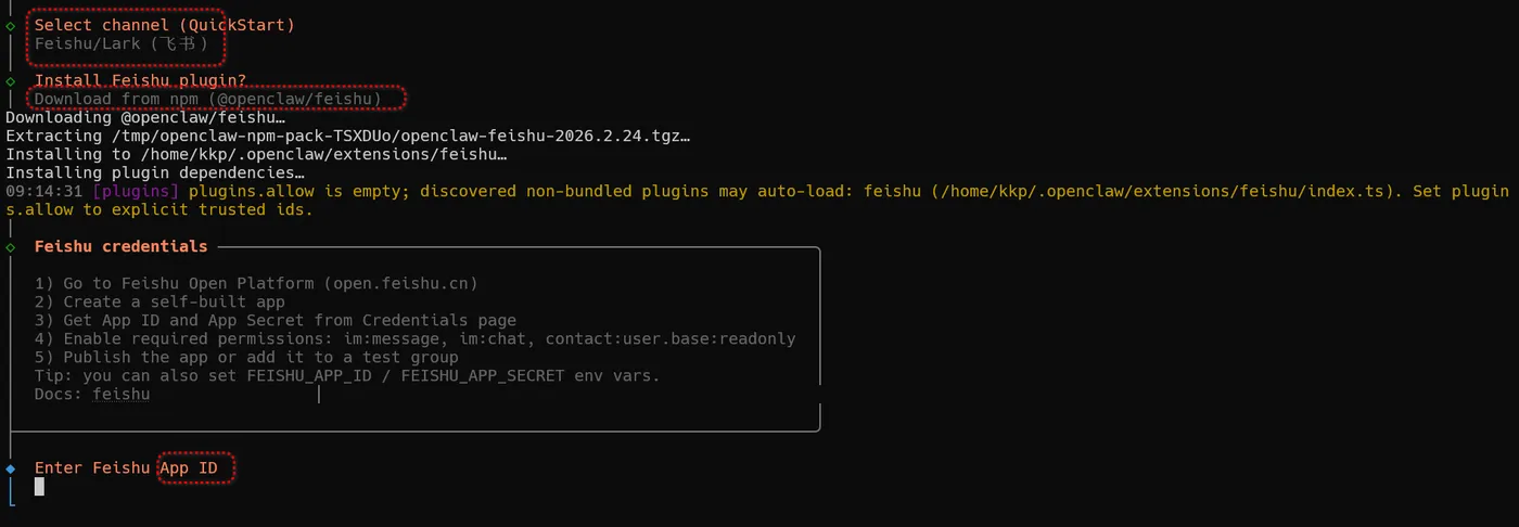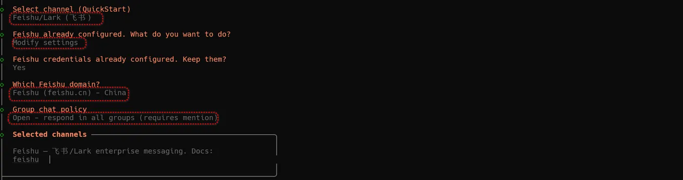 9、在选择channel时候选项有很多,为了不使用魔法工具,这里我选择飞书,然后需要添加第二步看见的APP ID 和App Secret