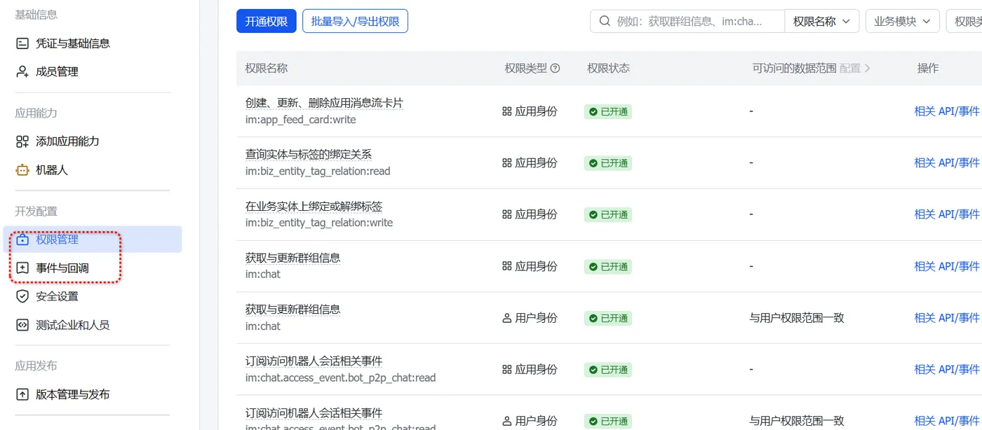 3、这里的权限设置要开通,特别是群组和身份认证的,可以单独搜索验证一下这个【contact:contact.base:readonly】权限,这个权限不开通后面会一直提醒。