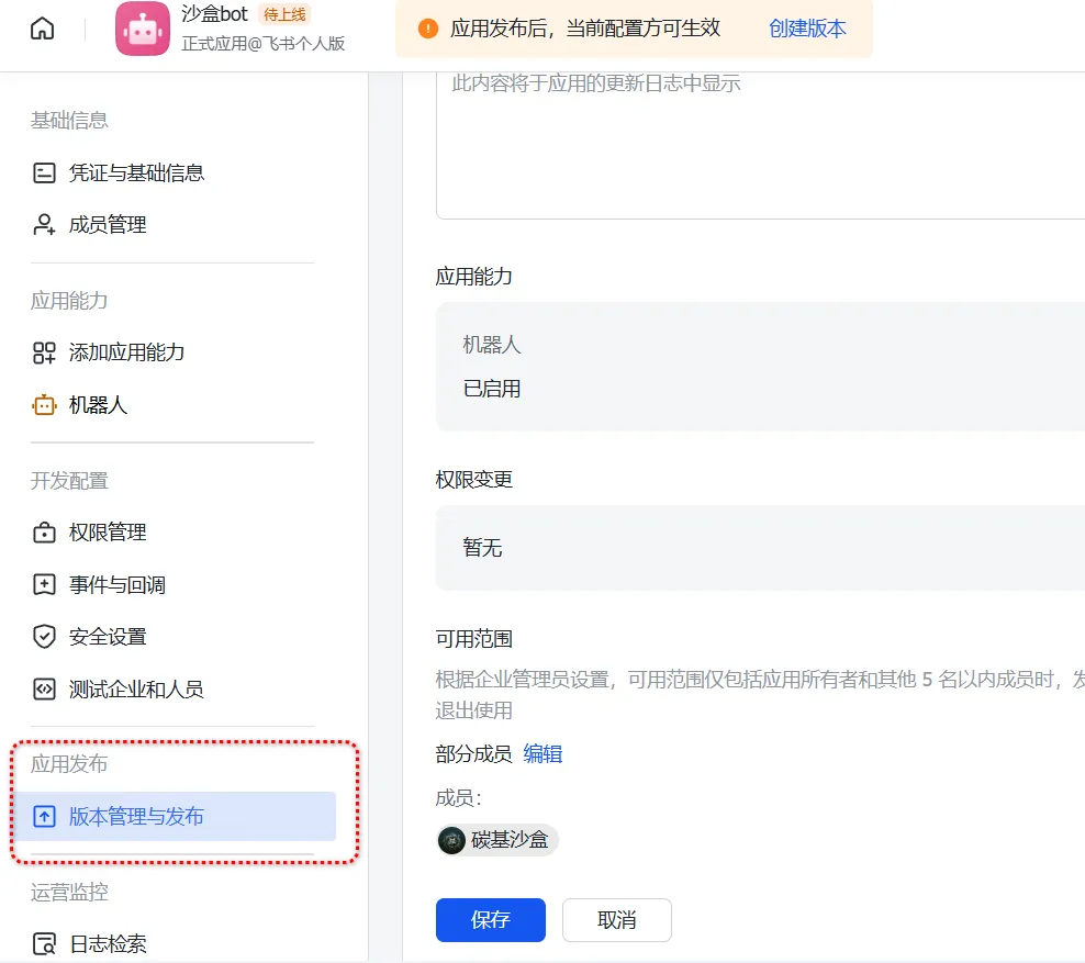 5、每次修改完权限或者事件都要重新发布,创建版本就可以了。如果出现配置没有生效就检查是否创建成功。
