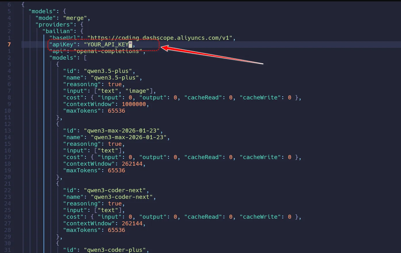 13、修改openclaw的配置接入模型和agent,文件路径是~/.openclaw/openclaw.json,可以直接修改或者添加对应模型的信息,我也在文章最后提供了我的配置文档,大家可以参考一下,这里我是购买了阿里百炼的套餐,只需要修改配置文件里的Apikey就可以了。