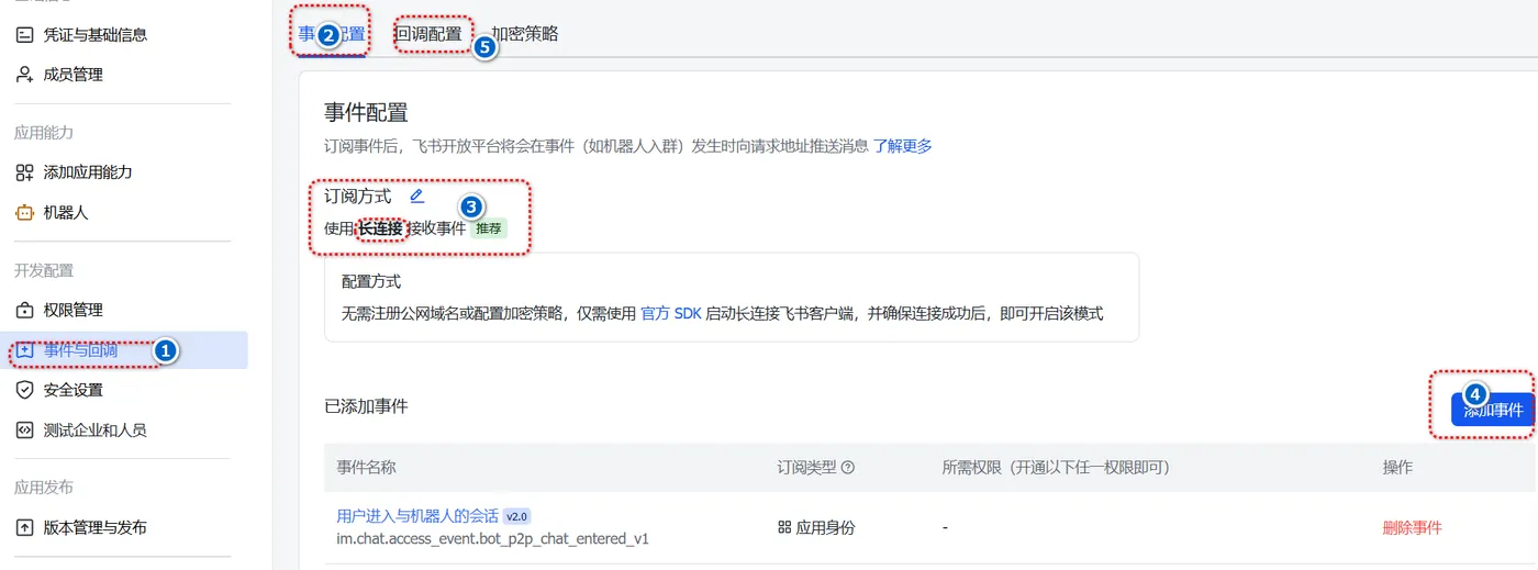 4、选择事件与回调,这里选择订阅的方式是长链接,然后注意要添加事件,事件主要是添加群组和对话的,添加完事件后记得添加回调的,这里的事件和回调不开启会导致机器人没有反应的。