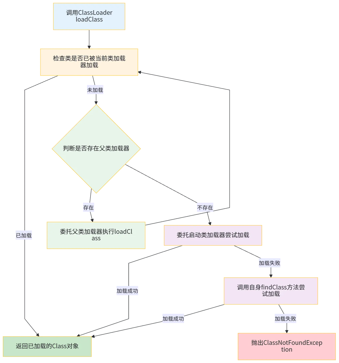 | findLoadedClass(String name) | 查找已被当前类加载器加载过的类,缓存查询入口 | final修饰,不可重写,只能调用 |