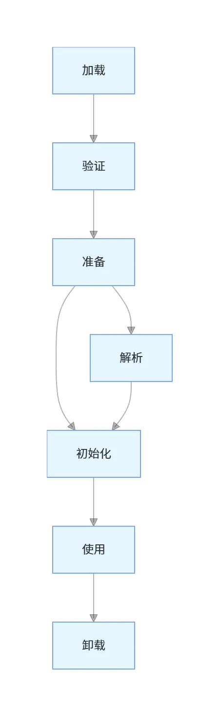 类的完整生命周期分为7个阶段:加载→验证→准备→解析→初始化→使用→卸载,其中加载、验证、准备、初始化、卸载的执行顺序是固定的,解析阶段可在初始化之后执行(支持运行时绑定,即动态分派)。
