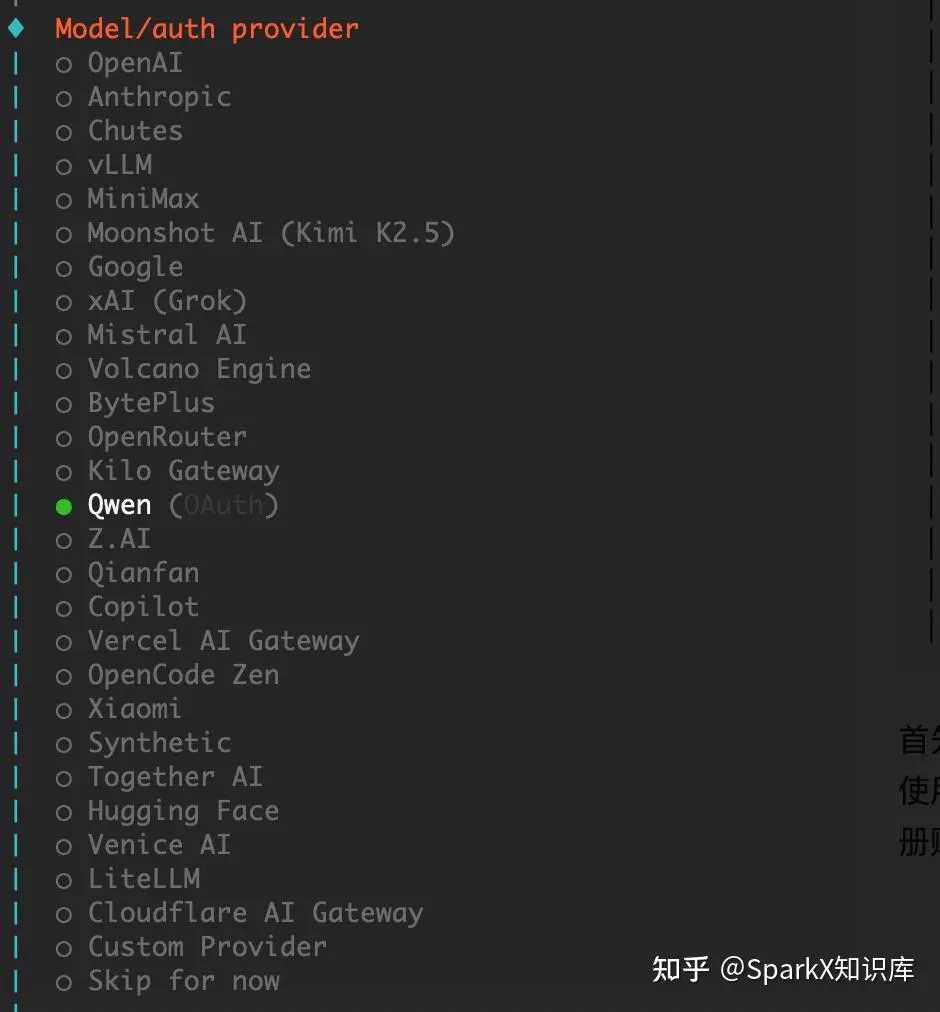 首先你要知道,小龙虾他只是一个node写的应用,他本身没有任何的AI能力,他的能力的强弱好用与否取决于你使用的模型。因此一个好用的大模型事半功倍。这里我们可以选择 Qwen , Qwen 作为国产模型的佼佼者,并会注册赠送免费额度,可以方便我们快速体验。按住方向键 下,选择到 Qwen,并按 enter。