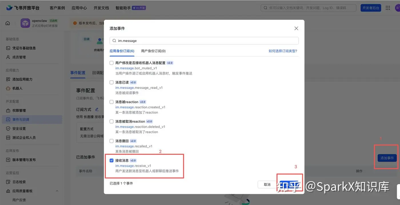 点击下方的添加事件,并,输入 im.message ,勾选最后的 接收 消息,并点击添加。