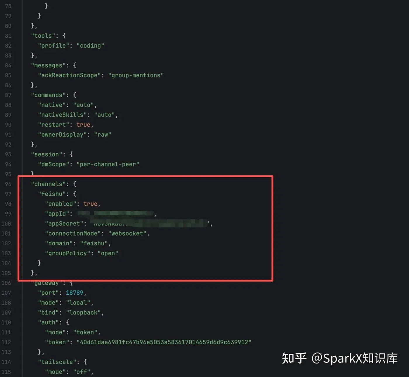 "channels": { "feishu": { "enabled": true, "appId": "cli_a924d89b16b89bd1", "appSecret": "RbV3Nkbd7bX42Gt9tTiqqX0IjCjUTvEl", "connectionMode": "websocket", "domain": "feishu", "groupPolicy": "open", "dmPolicy": "open", "allowFrom": [ "*" ] } }