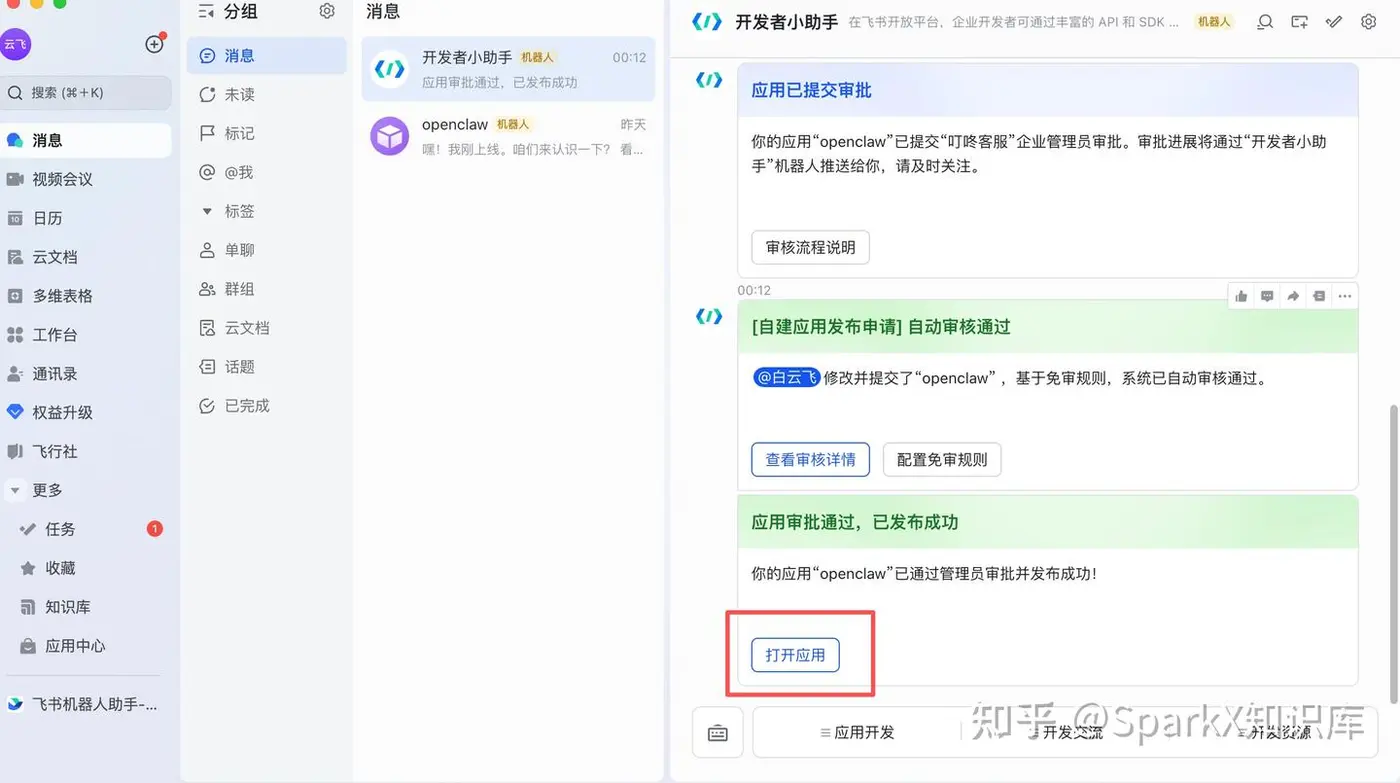 这个时候我们打开飞书客户端。可以开大发布的机器人。我们点击打开应用
