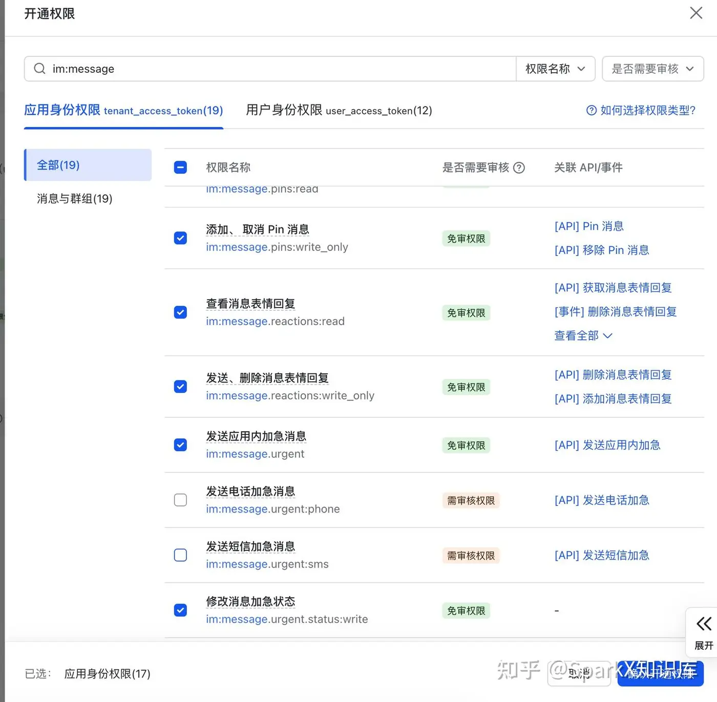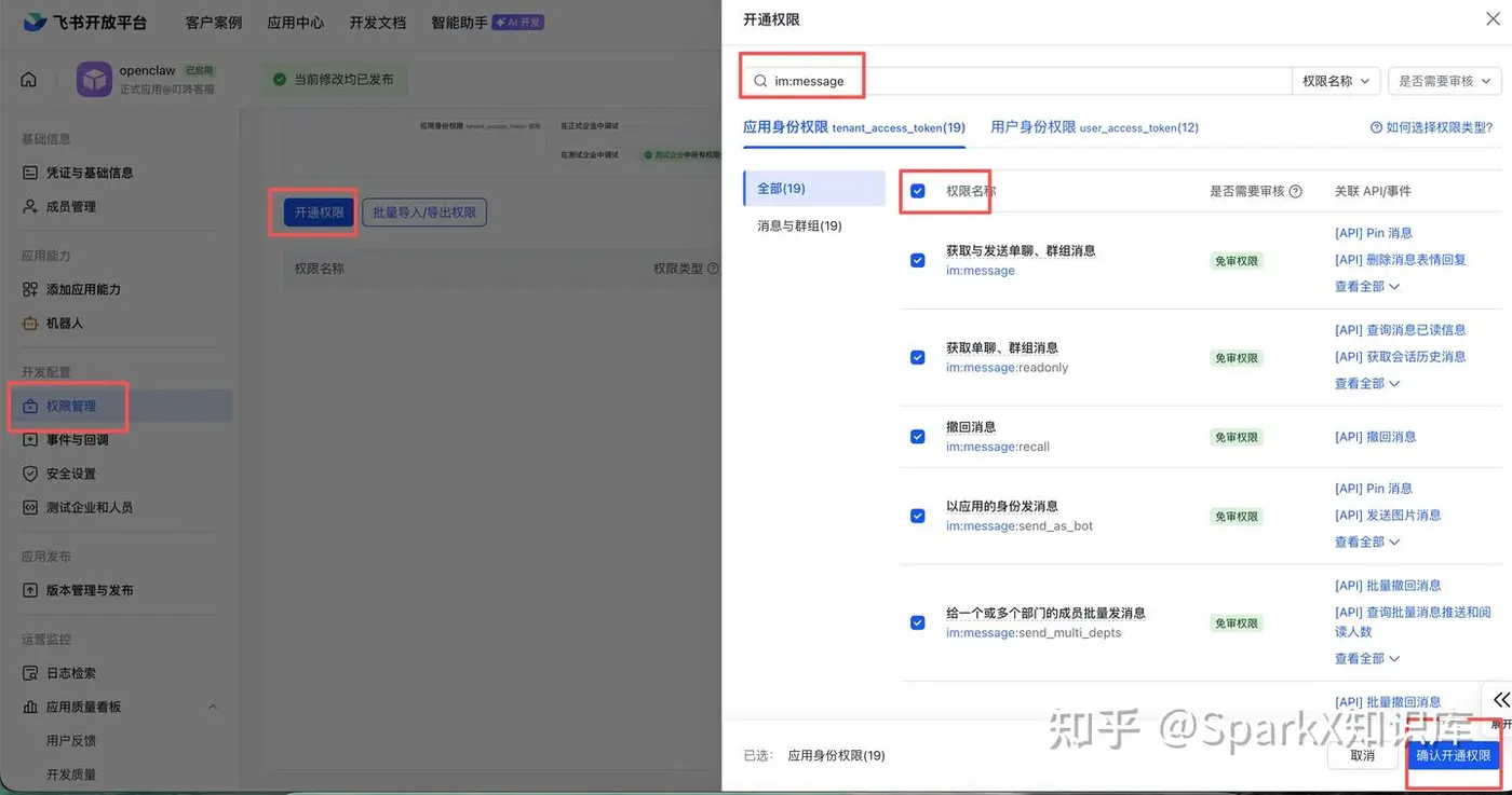 | im:message | 消息 全部勾选 | 发送和接收消息 |