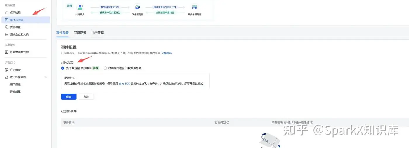 点击 事件与回调,会显示如下页面。配置长连接即可。点击保存。