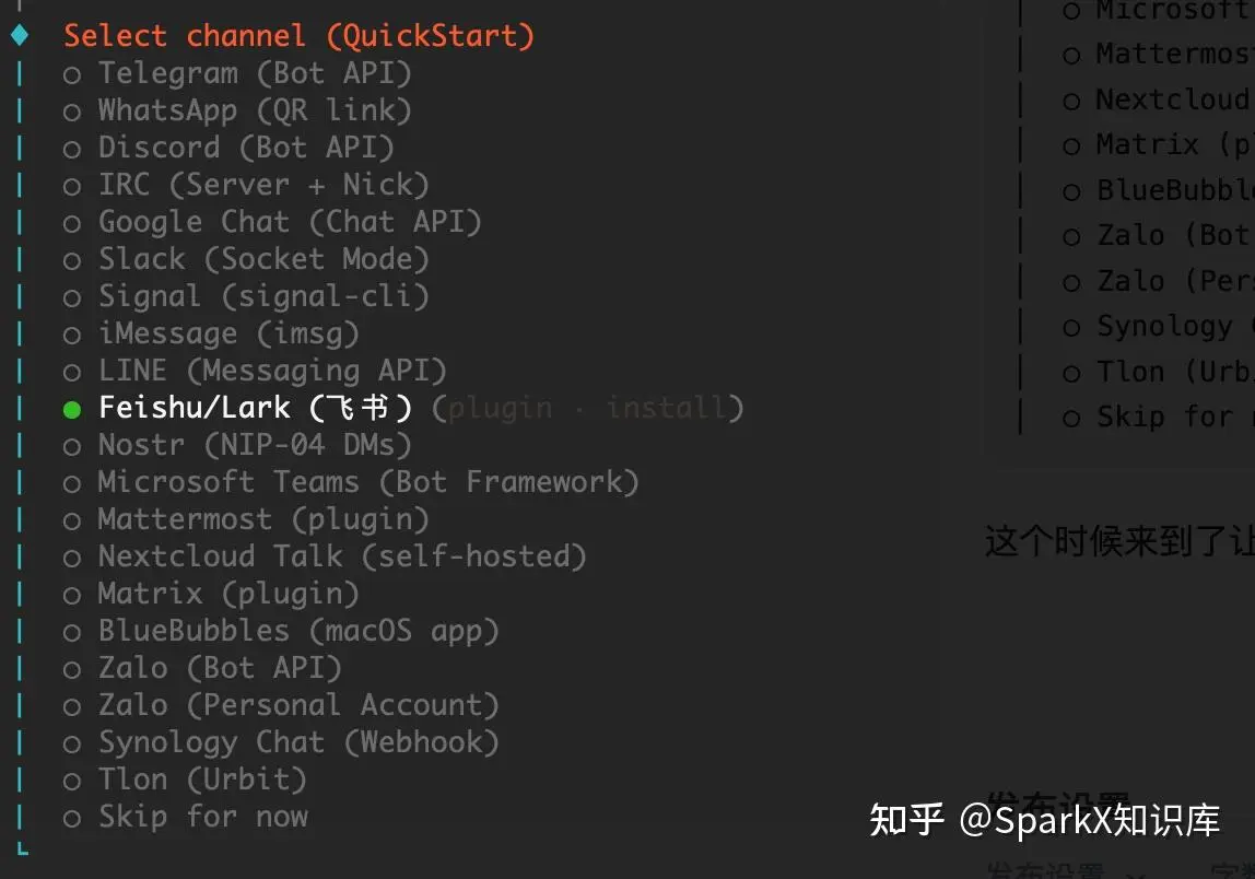 这个时候来到了让我们选择渠道,这也是 OpenClaw 首先带入的概念,可以远程控制智能体干活。我们选择飞书