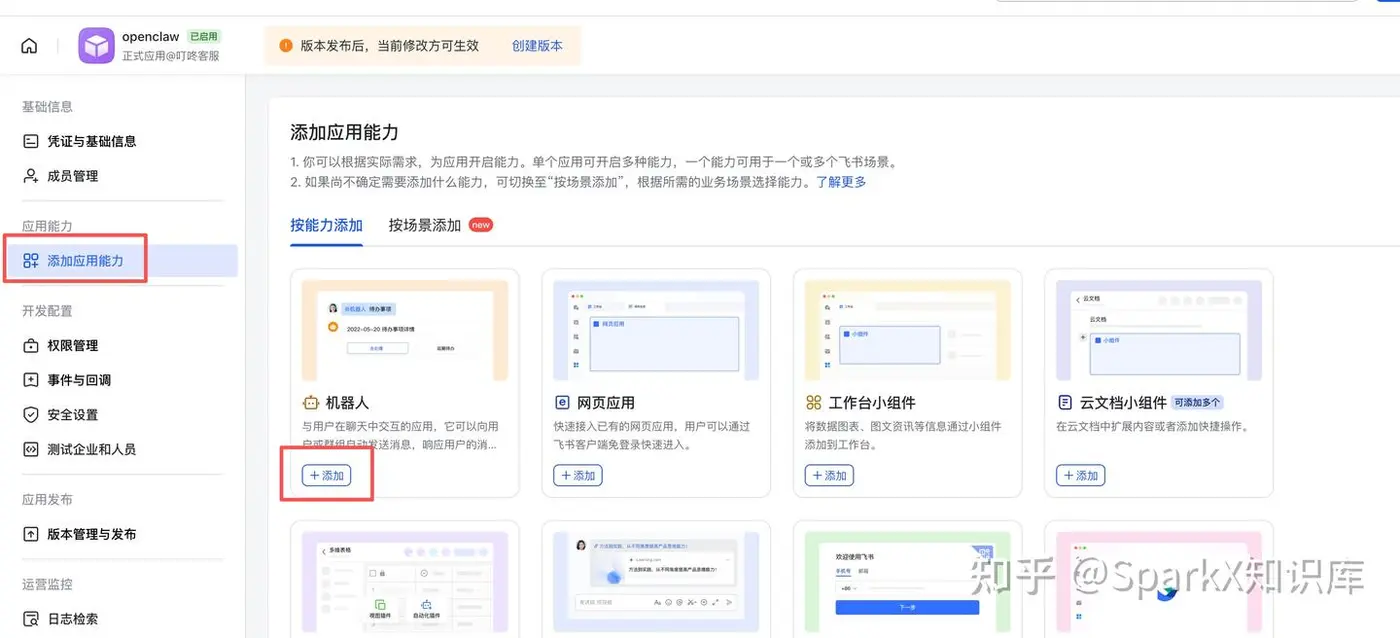 进入飞书页面点击添加应用能力,点击 机器人 ,并点击添加。添加机器人,我们给机器人取个名字