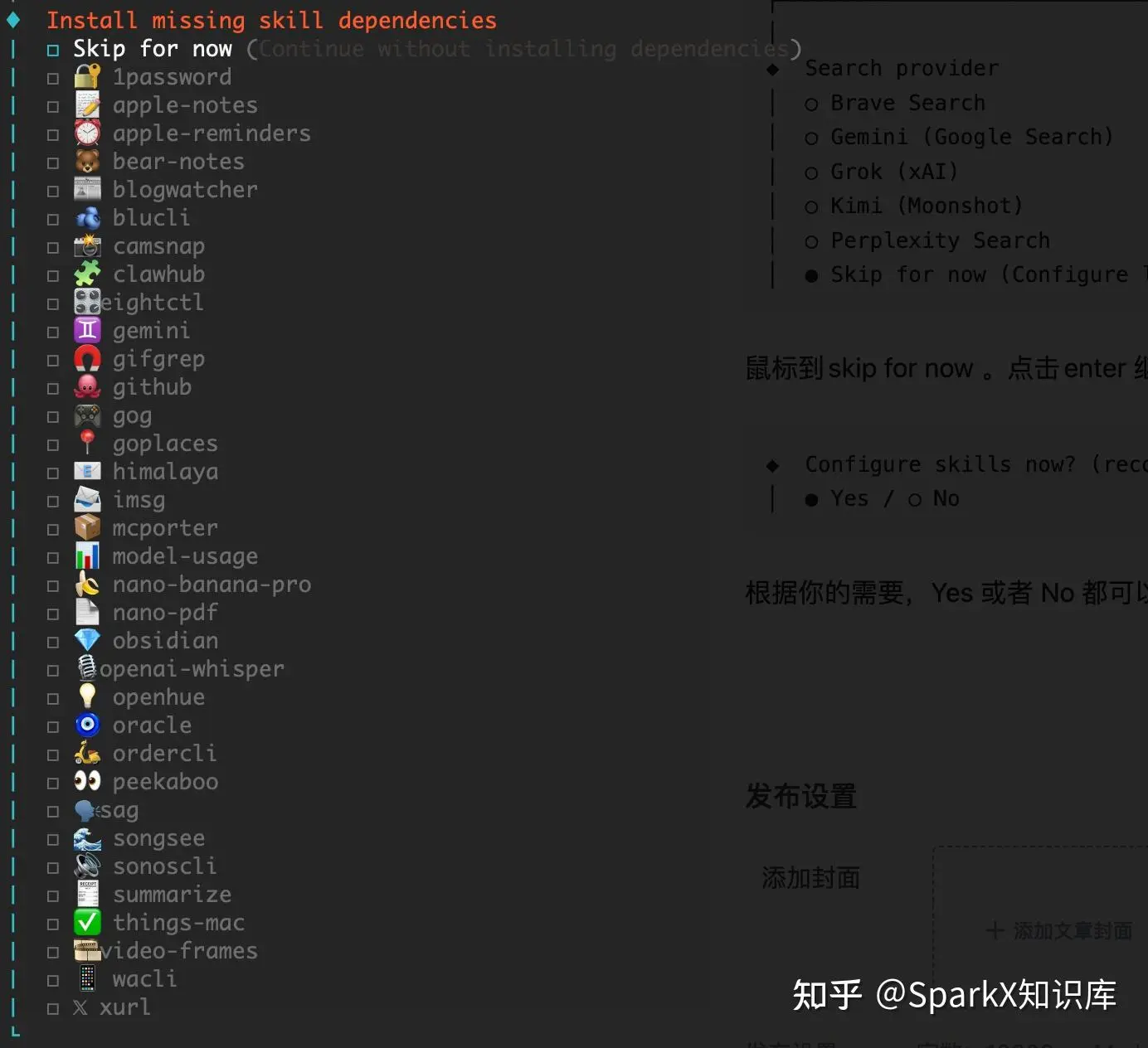 根据你的需要,Yes 或者 No 都可以。这里我们选择Yes ,系统会罗列一大堆的技能让我们勾选这个时候,你如果想选择,就按着 空格 键,在项目上选,或者选择第一个 跳过。如果选择了技能系统会安装这些技能,如果不选,则会跳过。