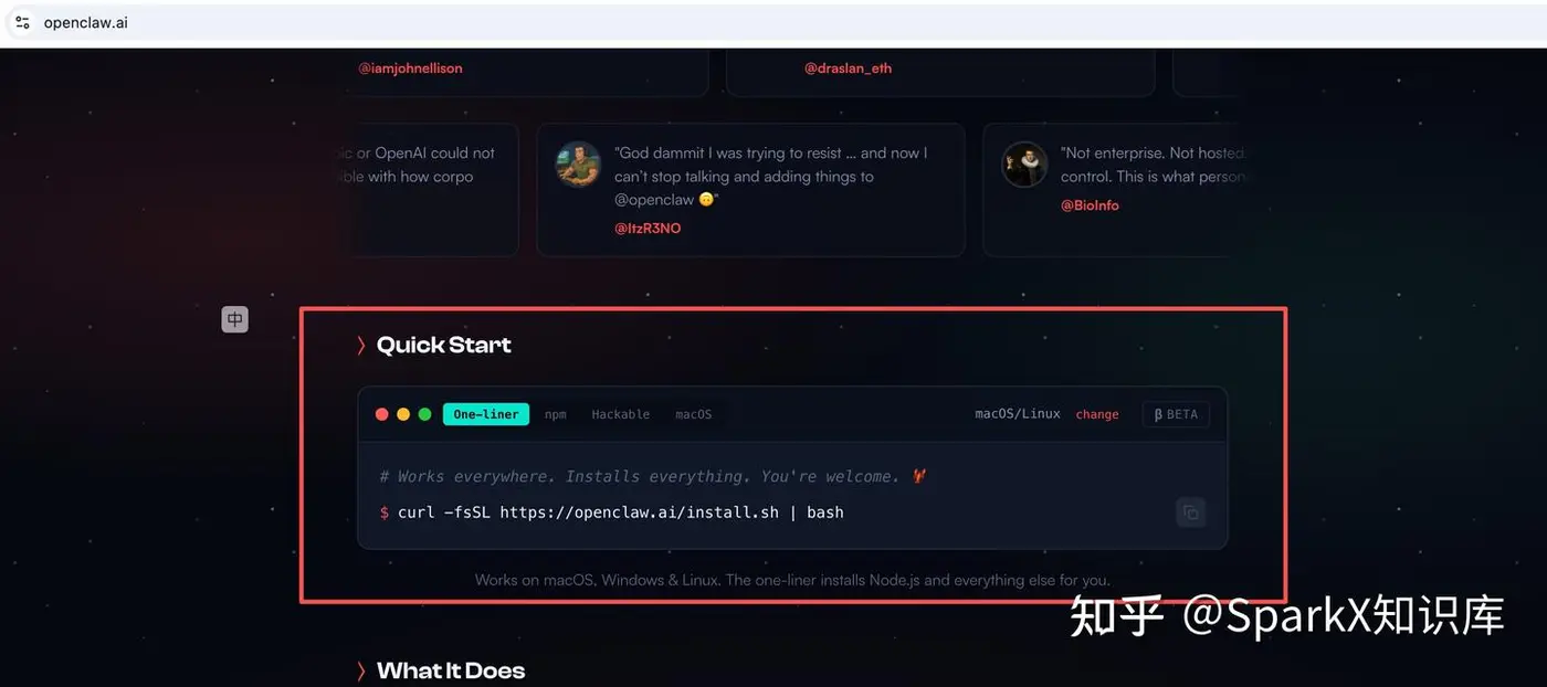 打开 OpenClaw 的官网 OpenClaw — Personal AI Assistant 。复制安装脚本