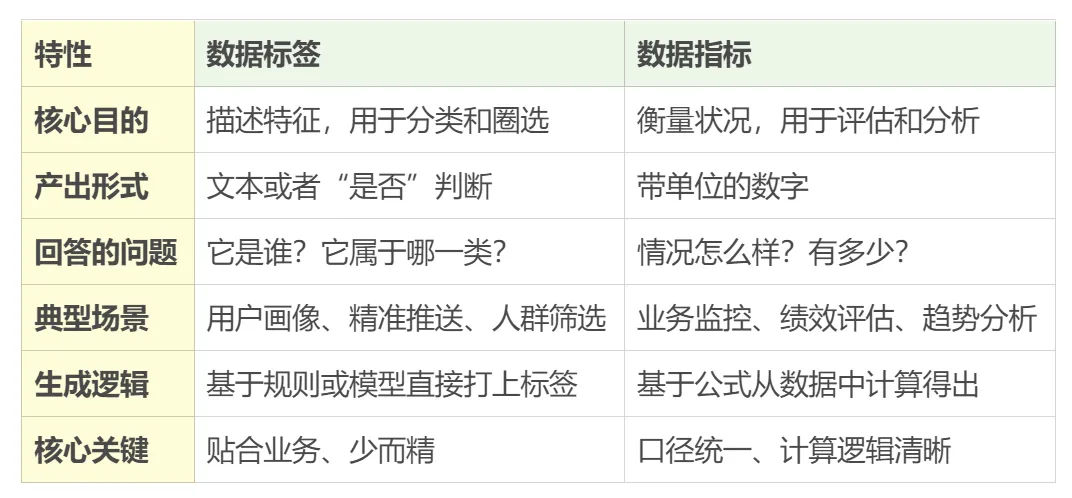 今天我就结合这些年的实战经验,再参考行业内的常用知识,把数据标签和数据指标的区别、用法,还有一些容易忽略的细节,一次性讲透。