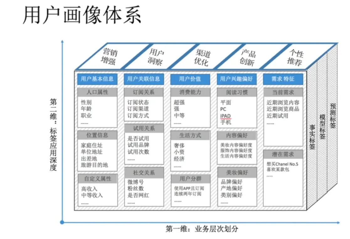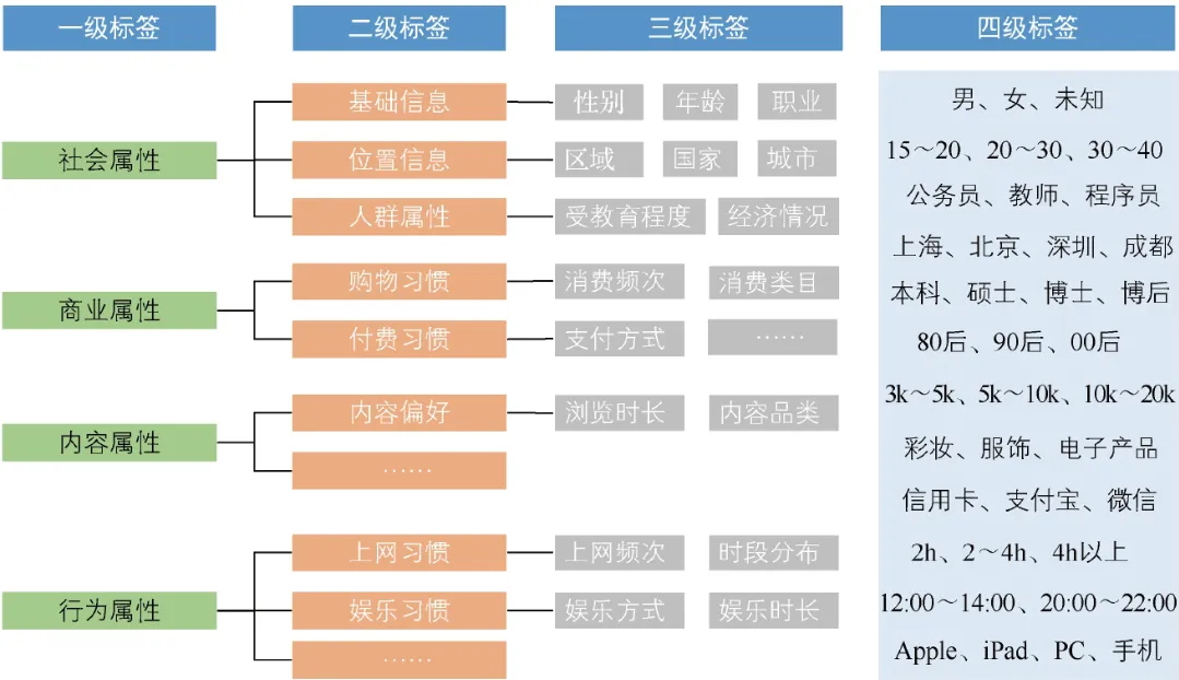 - 模型标签:通过算法模型预测出来。比如预测一个用户“换机意愿强烈”或“有购房潜力”。它带有预测性,也是动态变化的。