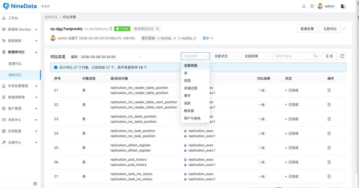 NineData 支持对数据库对象进行全量、逐项对比,包括: