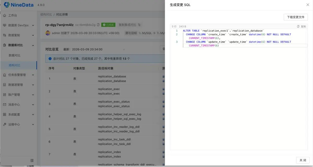 这是数据对比最核心的价值之一:发现差异后,自动生成标准化修复语句,包括: