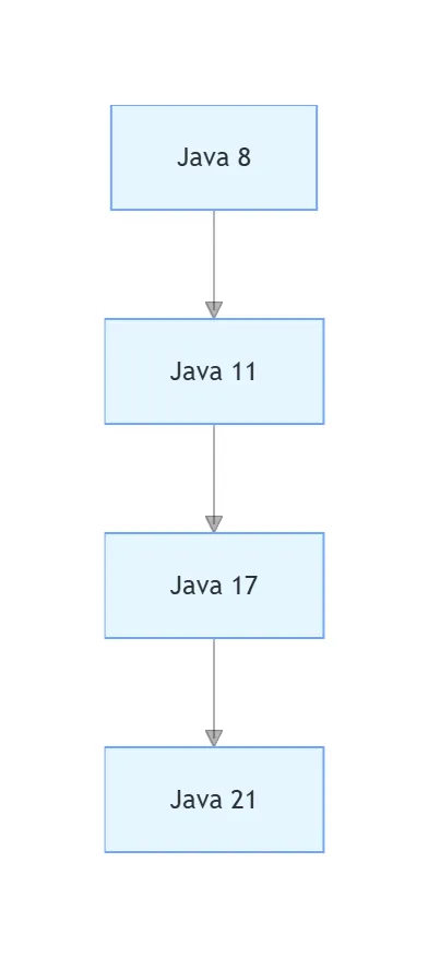 推荐采用分阶段升级的方式,降低升级风险,不建议直接从Java 8一步升级到Java 21,推荐升级路径: