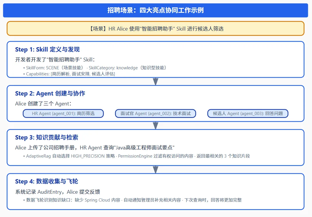 让我们通过一个招聘场景来展示四大亮点如何协同工作:
