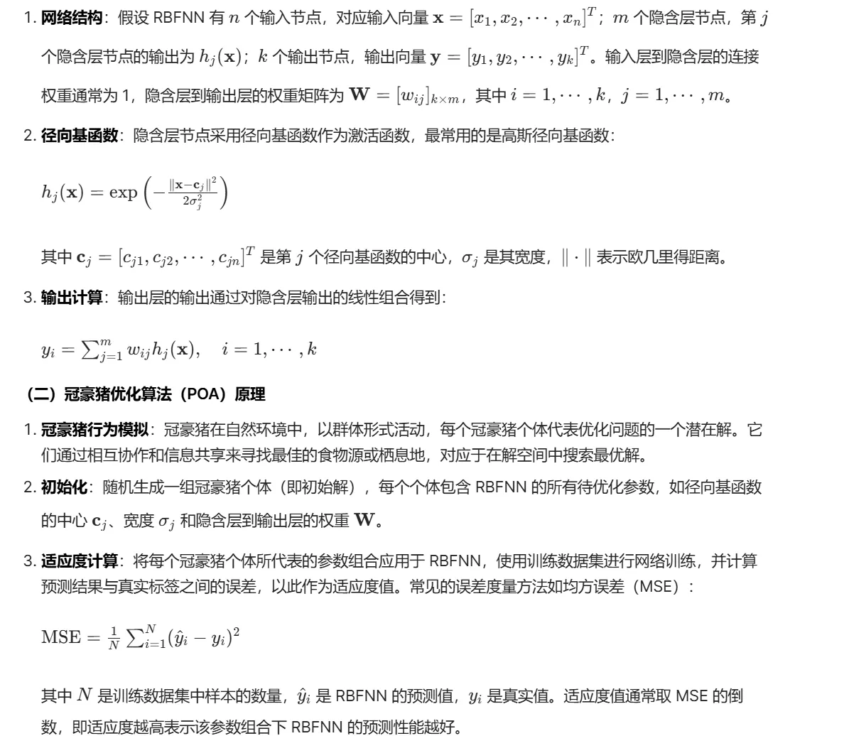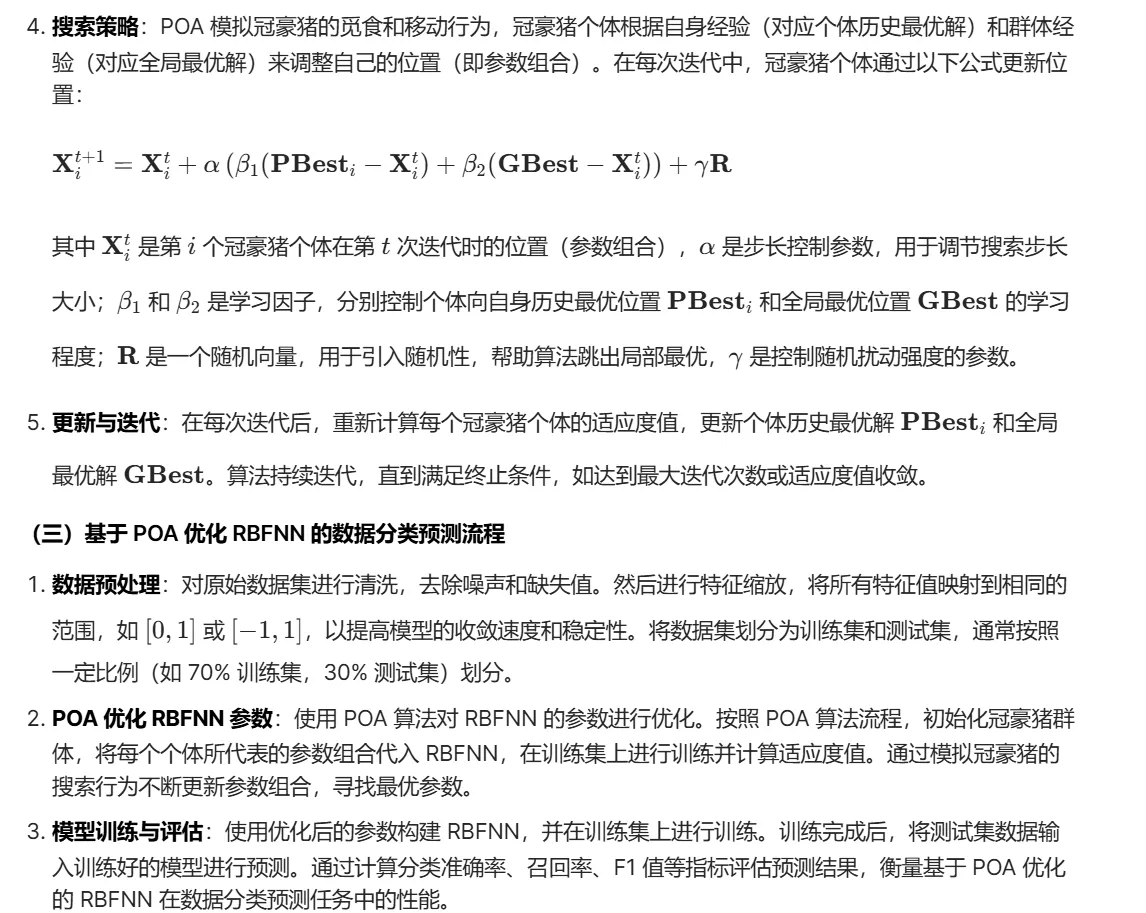 冠豪猪优化算法(Porcupine Optimization Algorithm, POA)是一种受冠豪猪行为启发的新型元启发式优化算法。冠豪猪在寻找食物和栖息地时,展现出独特的群体协作和搜索行为。POA 模拟这种行为,具有较强的全局搜索能力和较快的收敛速度。在优化 RBFNN 参数时,POA 能够在复杂的参数空间中高效搜索,避免陷入局部最优,从而为 RBFNN 找到更优的参数组合,提高数据分类预测的准确性。