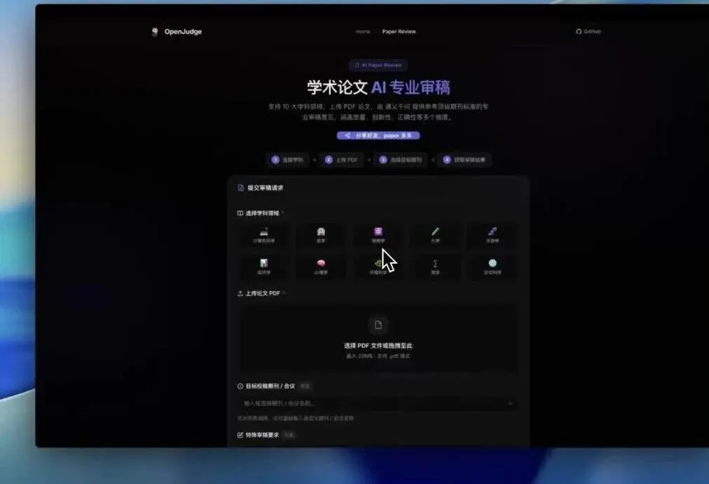 打开 https://openjudge.me/ 进入论文审稿页面后,你会看到一个简洁的操作界面。最核心的操作就是上传一篇 PDF 格式的论文。