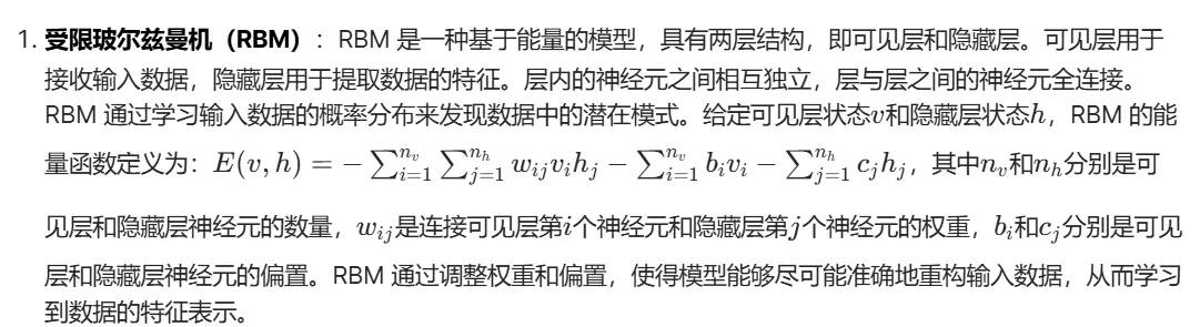 - 受限玻尔兹曼机(RBM):RBM 是一种基于能量的模型,具有两层结构,即可见层和隐藏层。可见层用于接收输入数据,隐藏层用于提取数据的特征。层内的神经元之间相互独立,层与层之间的神经元全连接。
