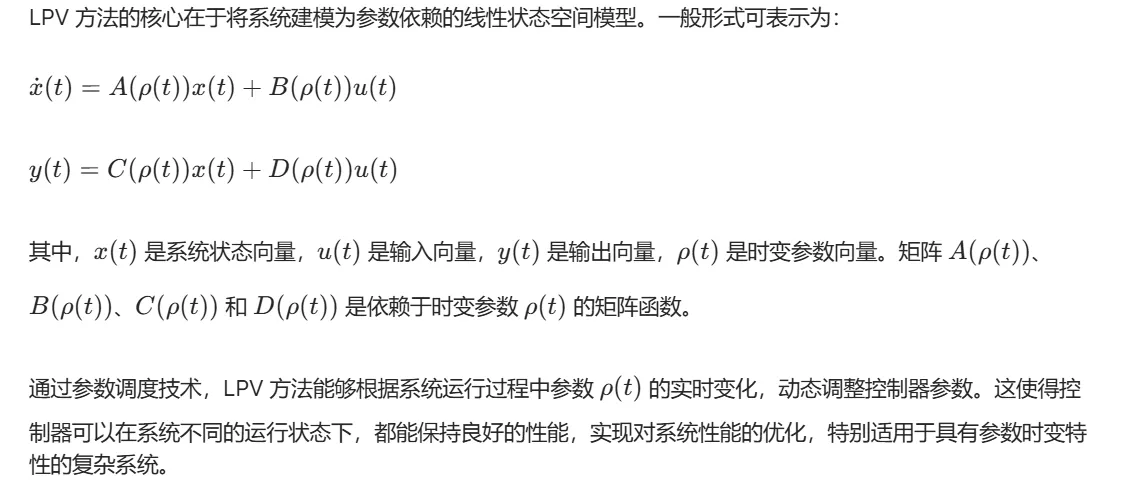 线性参数变化(LPV)系统是一种特殊的动态系统,其参数会随着时间或其他相关变量线性变化。与传统的定常系统不同,LPV 系统能够捕捉系统在运行过程中的动态变化特性。