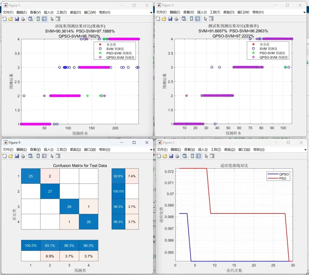 - QPSO-SVM 原理:QPSO-SVM 是在 PSO-SVM 基础上,采用量子粒子群优化算法(QPSO)替代 PSO。QPSO 基于量子力学原理,粒子位置更新具有不确定性,相比 PSO 有更强的全局搜索能力和更快的收敛速度。它同样用于优化 SVM 的参数,能更有效地在参数空间中搜索,找到使 SVM 模型性能更优的参数,进一步提升多特征分类预测的性能,尤其是在处理复杂数据集时效果更明显。