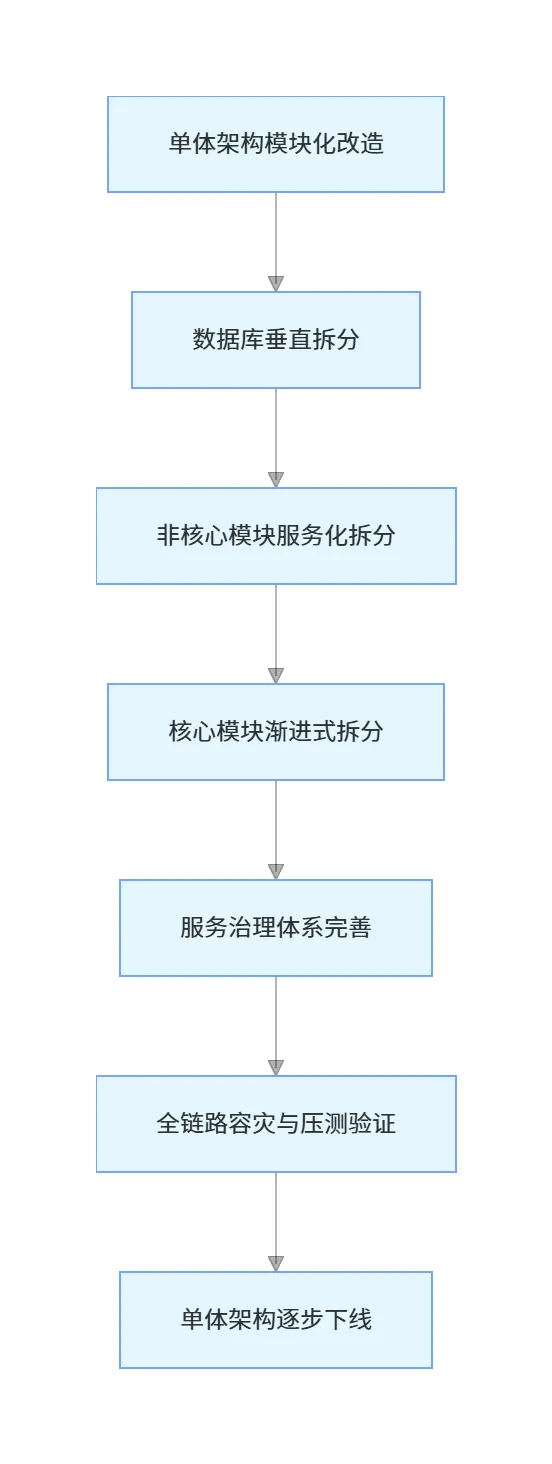 以电商核心链路为例,拆分顺序建议:用户服务 → 商品服务 → 订单服务 → 支付服务,每拆分完一个服务,都要经过充分的验证,再进行下一个服务的拆分。