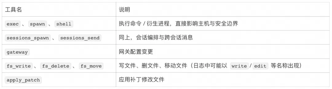 OpenClaw 的工具权限体系(Tool Policy Pipeline + Owner-only 封装)已经在运行时做了管控,但可观测层应该独立于运行时防护进行监控——万一策略配置有误,可观测层是最后的发现机会。高危工具的定义按使用场景分为两类。