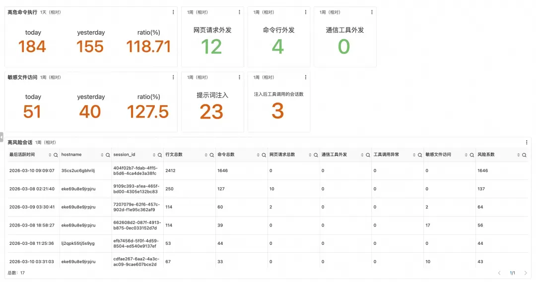 总览页应以指定时间窗口内的多维高危操作计数为核心,将 Agent 的安全态势压缩为一屏可读的风险快照。核心指标包括:高危命令执行数、网页请求外发数、命令行外发数、通信工具外发数、敏感文件访问数、提示词注入事件数,以及注入后的高危操作数。配合环比数据,帮助安全团队快速判断当前风险水位。