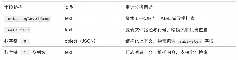 _meta.logLevelName:日志级别(TRACE/DEBUG/INFO/WARN/ERROR/FATAL);_meta.path:源码文件路径和行号,用于精确定位;- 数字键