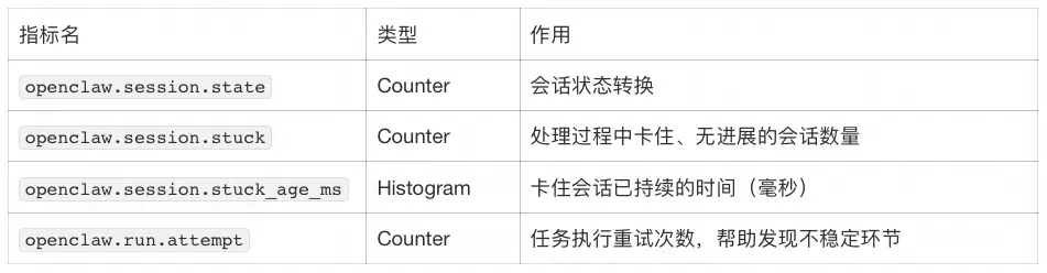 会话状态变化与卡住会话数量反映交互健康度。监控卡住、重试等指标可快速发现陷入死循环或异常状态的对话,提升可观测与排障效率。